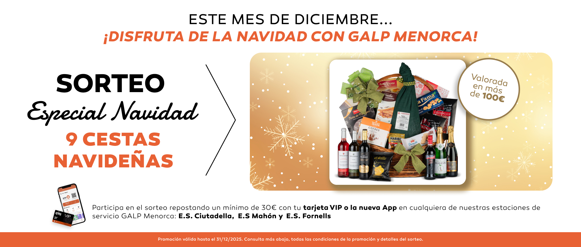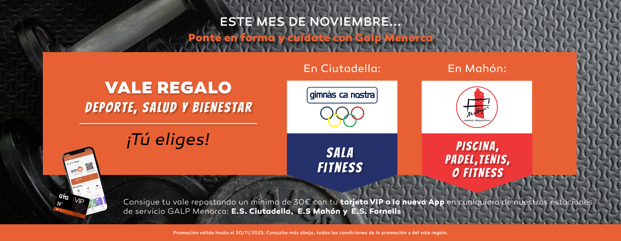 *Promoción válida del 01/11/2025 el 30/11/2025. Aplicable solo a repostajes mínimos de 30€ de combustible con la tarjeta VIP en cualquiera de nuestras Gasolineras Galp Menorca: E.S. Ciutadella, E.S. Mahón & E.S. Fornells.