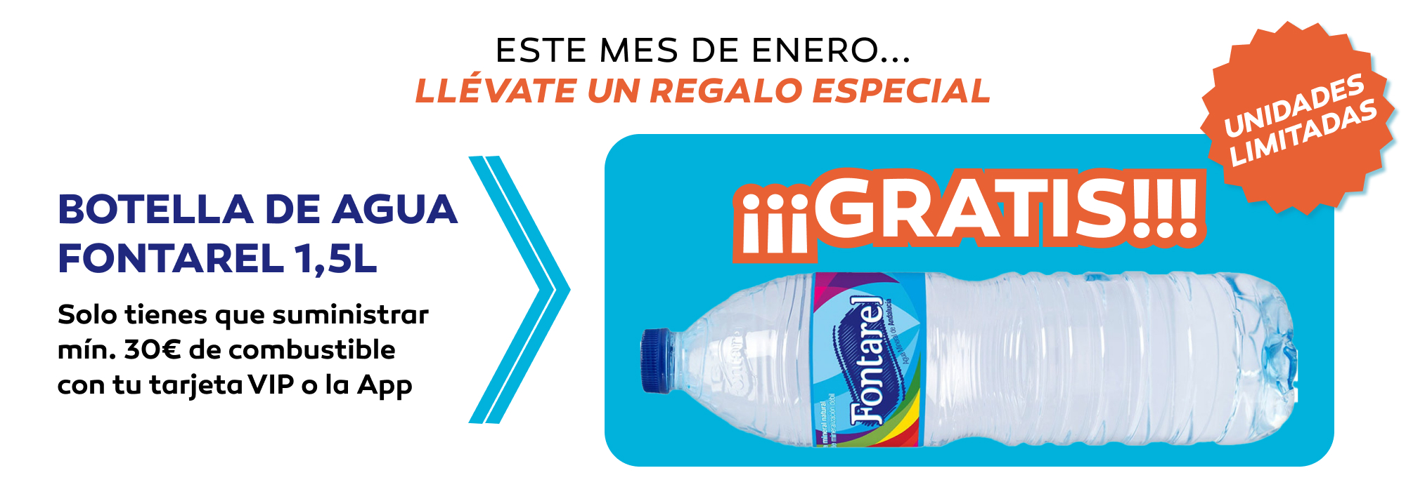 Si realizas un suministro mínimo de 30 € en combustible, te llevarás una botella de agua Fontarel de 1,5 litros totalmente gratis.